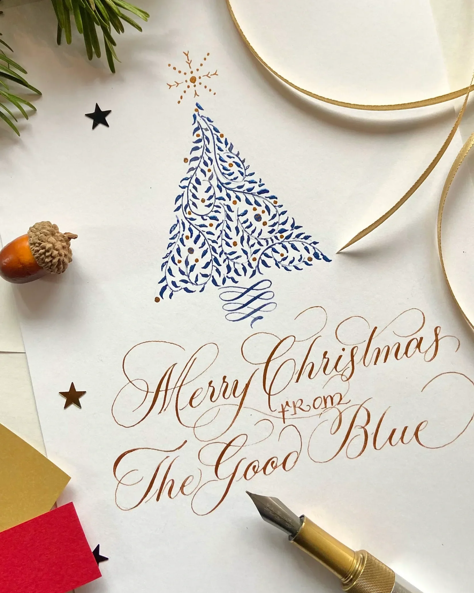 Experience the beauty of calligraphy with The Good Blue. Enjoy complimentary handwritten Christmas cards or gift tags to take home and share with your loved ones.